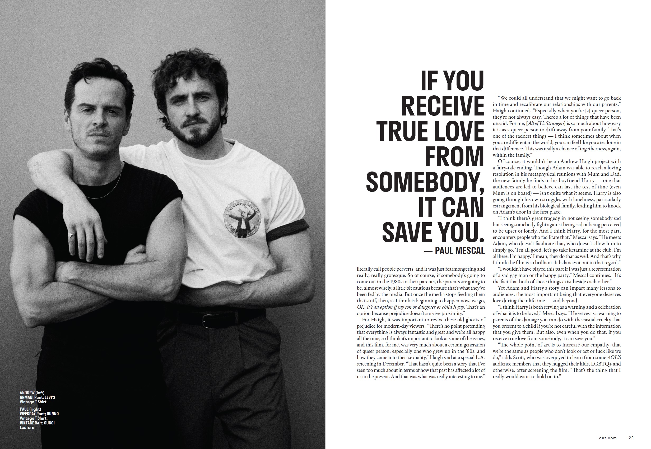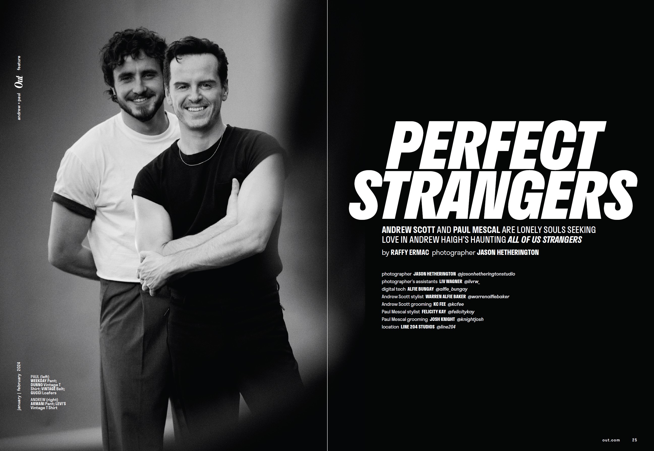 Profile on actors Andrew Scott and Paul Mescal of Searchlight Pictures’ All of Us Strangers, from the January/February 2024 issue of Out. Read here.